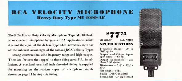 Like its bigger brother, it was bidirectional and could therefore be spoken to from either side. Although simpler in design than the 44BX, it had the same warm sound so characteristic of RCA ribbon microphones.